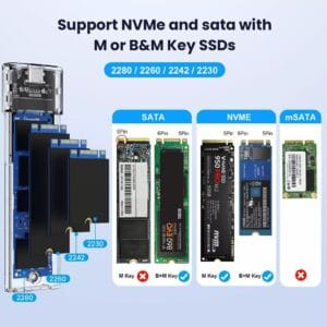 - Широкая совместимость: адаптер Folem NS1 совместим с твердотельными накопителями M.2 NVMe /SATA, поддерживая размеры 2230, 2242, 2260 и 2280.