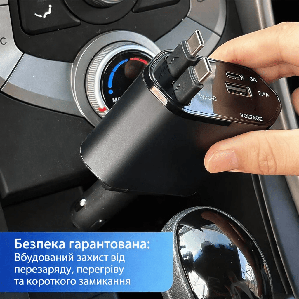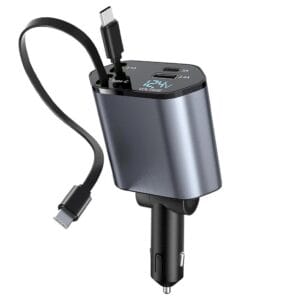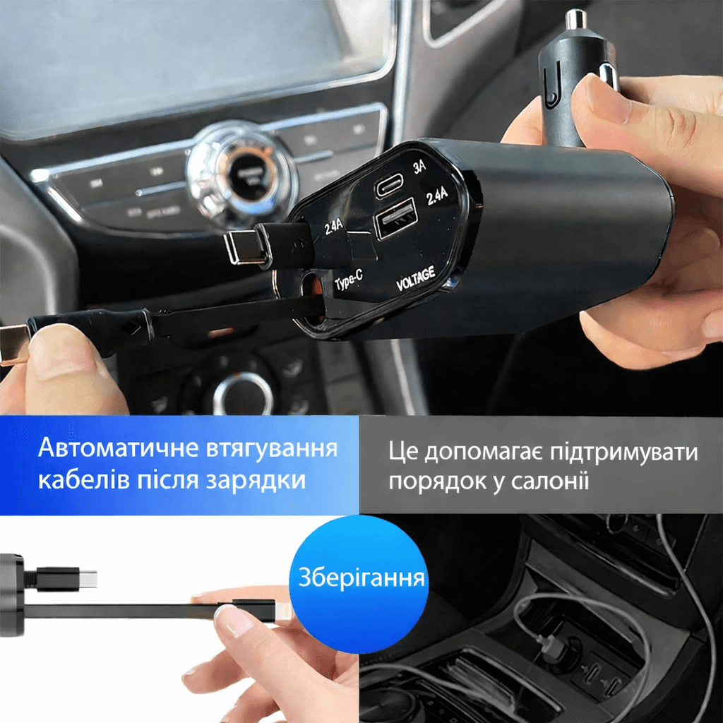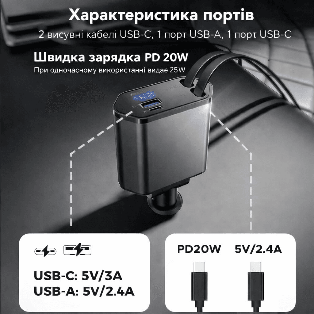 Устройство оснащено двумя встроенными выдвижными кабелями Type-C , а также дополнительными портами USB-C и USB-A, позволяющими заряжать до 4 устройств одновременно. Каждый кабель выдвигается примерно на 80 см и автоматически втягивается назад, обеспечивая порядок в салоне без запутанных проводов.