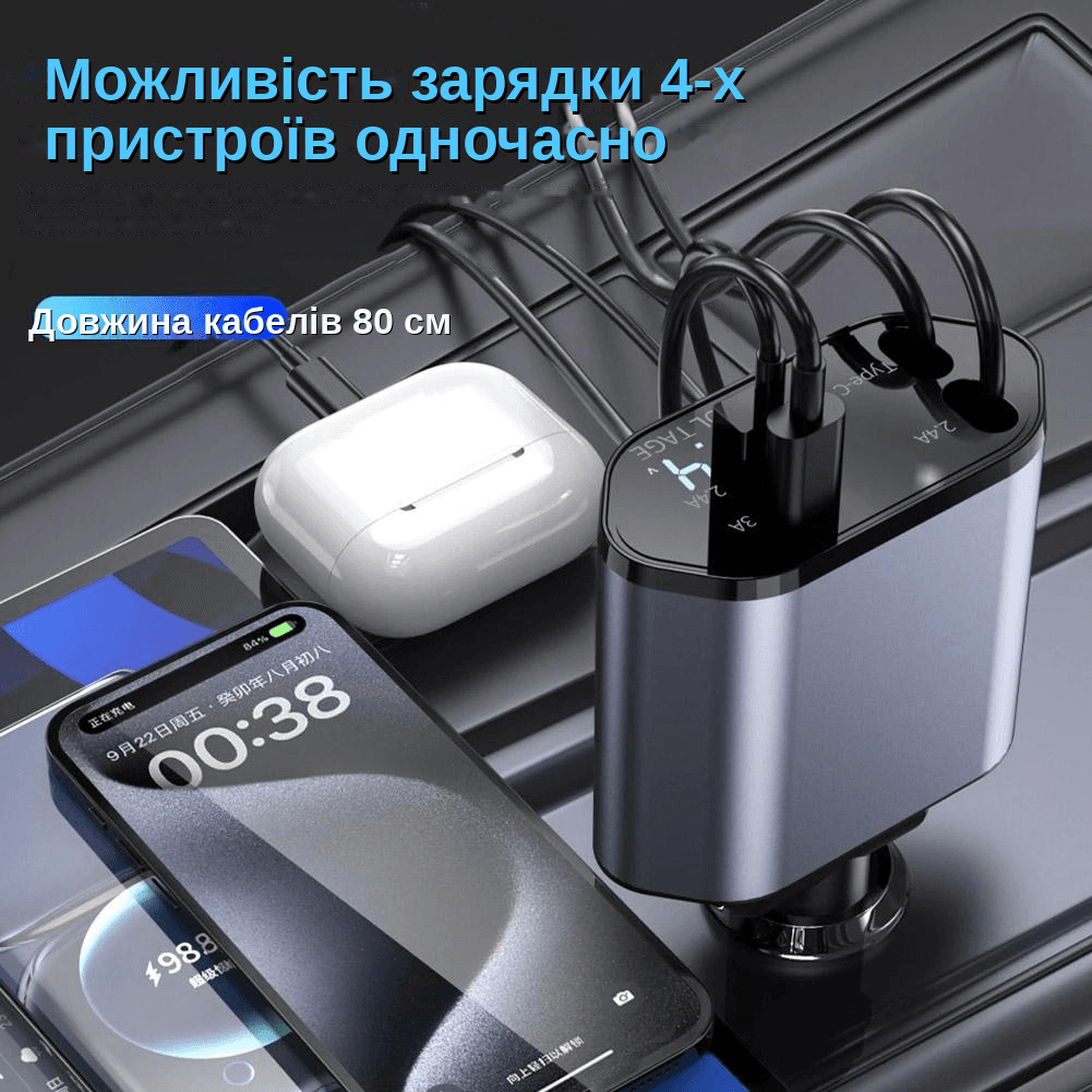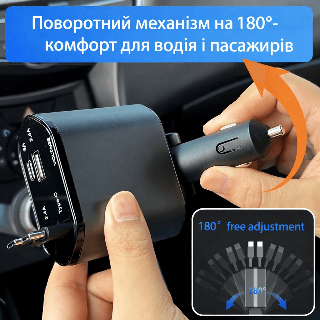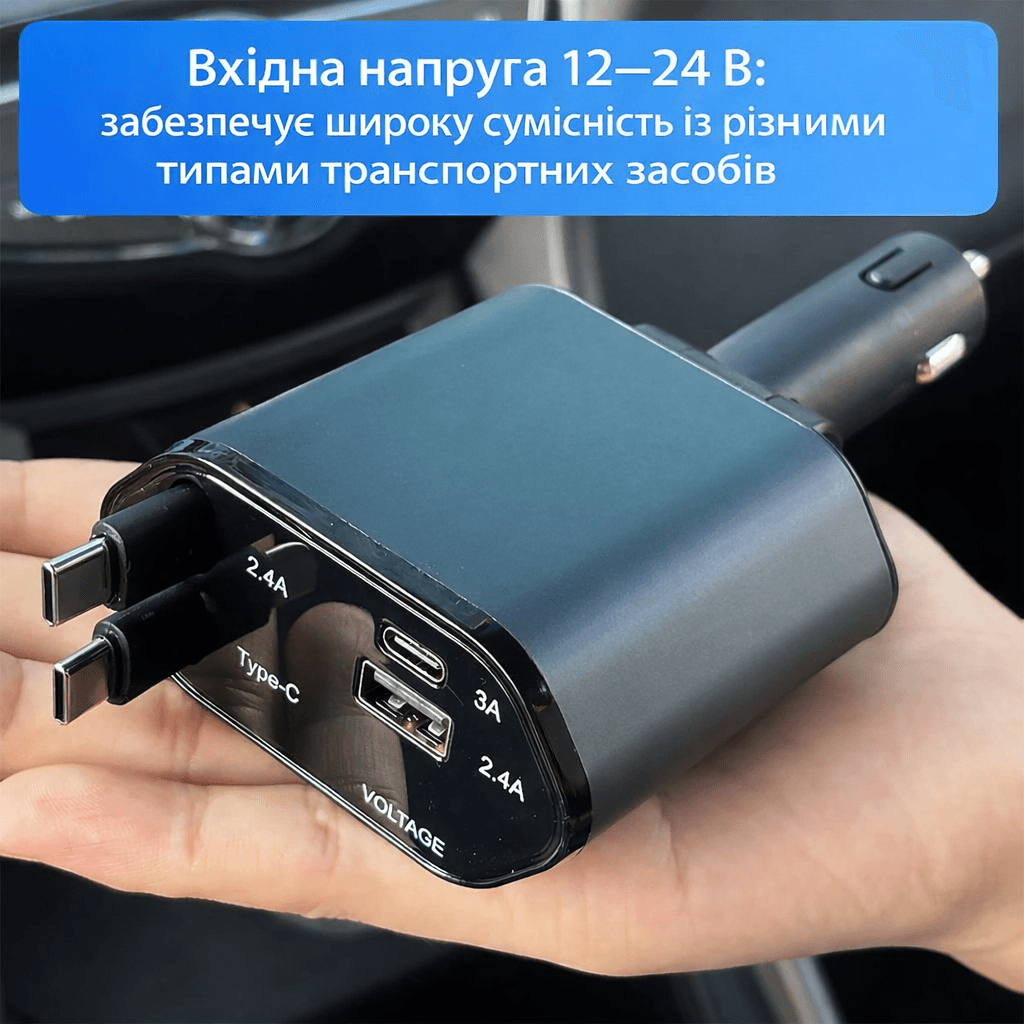 Устройство оснащено двумя встроенными выдвижными кабелями Type-C , а также дополнительными портами USB-C и USB-A, позволяющими заряжать до 4 устройств одновременно. Каждый кабель выдвигается примерно на 80 см и автоматически втягивается назад, обеспечивая порядок в салоне без запутанных проводов.