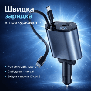 Устройство оснащено двумя встроенными выдвижными кабелями Type-C , а также дополнительными портами USB-C и USB-A, позволяющими заряжать до 4 устройств одновременно. Каждый кабель выдвигается примерно на 80 см и автоматически втягивается назад, обеспечивая порядок в салоне без запутанных проводов.