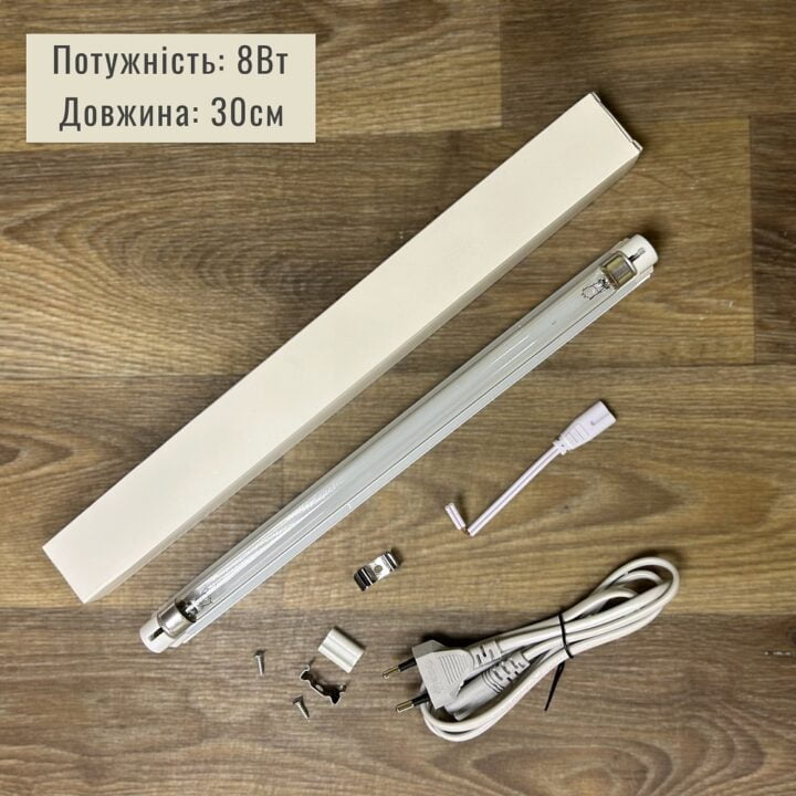 В комплекте: Стеклянная лампа закреплена в металлической основе, кабель 220V и набор монтажных креплений на стену. Запрещается находиться около включенной лампы длительное время, после дезинфекции помещения необходимо проветрить.