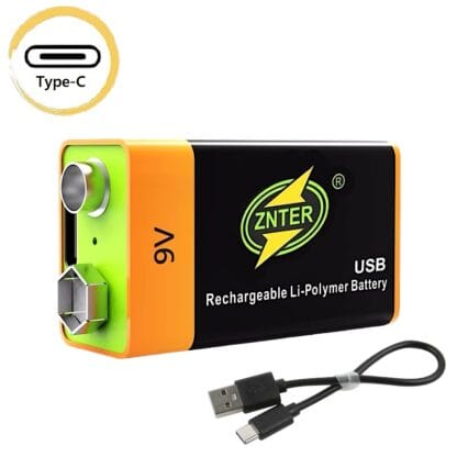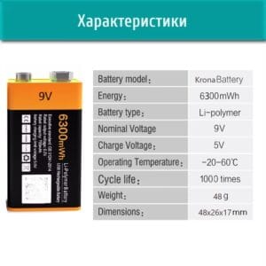 Данный аккумулятор является батарейкой по типу “Крона” 9 Вольт емкостью 6300mWh/700mAh. Его основным отличием является возможность перезарядки с помощью кабеля Type-C (входит в комплект ). Возможность перезарядки около 1000-1500 раз делает устройство долговечным в использовании и соответственно весьма выгодным. Зарядка осуществляется от сети с помощью адаптера питания, повербанка или компьютера. Это очень удобно, ведь вам не нужно дополнительно покупать зарядный блок. Во время заряда на батарейке горит встроенный световой индикатор.