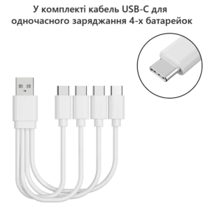 • Заряжается при помощи кабеля Type-C от любого USB порта, имеющего на выходе стандартное напряжение 5В, кабель для одновременной зарядки 4 батареек в комплекте;