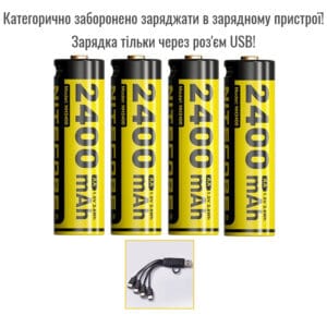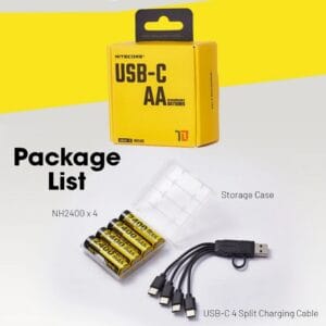 - Комплектация: 4 батарейки Nitecore NH2400, упаковка для хранения, USB/USB-C 4-разъемный кабель для зарядки.