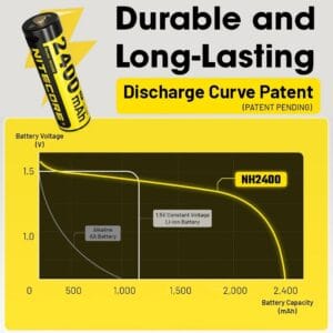 Особенностью аккумуляторов Nitecore NH2400 является мягкое снижение напряжения по мере разрядки. Это позволяет поддерживать длительный и постоянный выход энергии и приводит к увеличению времени работы устройств, а также к более стабильной работе.