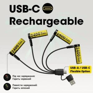 В комплект входят четыре батарейки и адаптер с четырьмя кабелями USB-C. Это позволяет заряжать все батарейки одновременно, что значительно экономит время. Полная зарядка аккумуляторов занимает около 3 часов. На каждой батарейке предусмотрен индикатор заряда: зеленый свет указывает на полную зарядку, а красный – на процесс зарядки, что упрощает контроль за состоянием аккумуляторов.