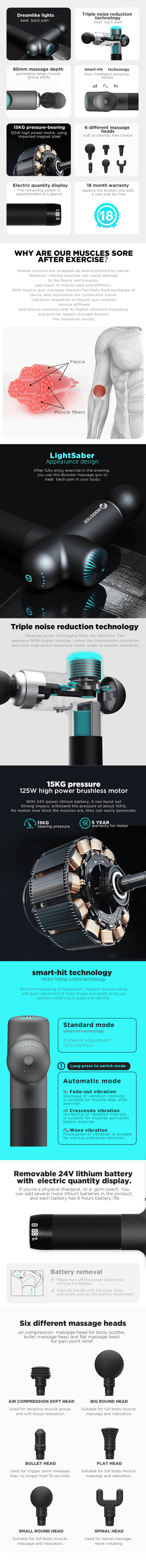 Бесщеточный электродвигатель нового поколения вместе с ультраёмкой 24-вольтовой литевой батареей обеспечивает мощную силу удара, создавая давление до 15кг. За счёт чего ударные вибрации проникают в более глубокие волокна мышц, разбивая триггерные точки.