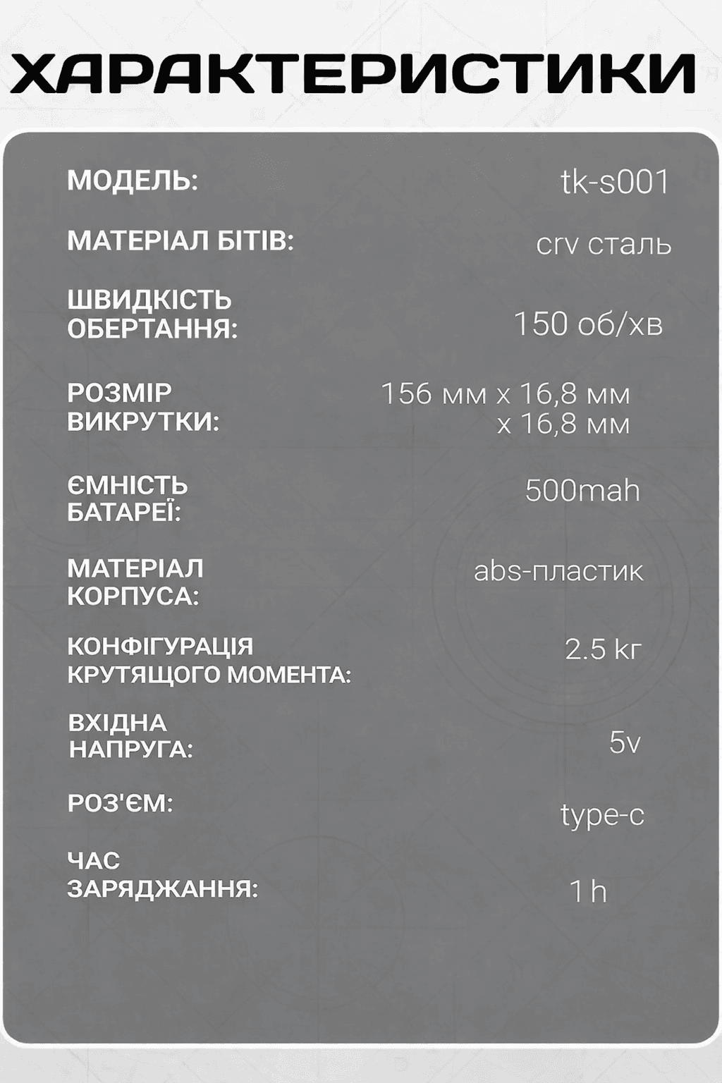 - Способ зарядки инструмента: Зарядка через USB Type-c