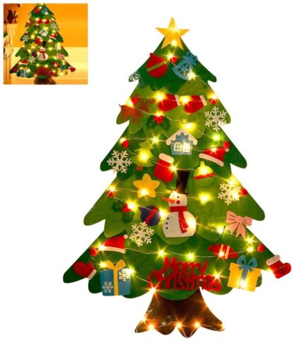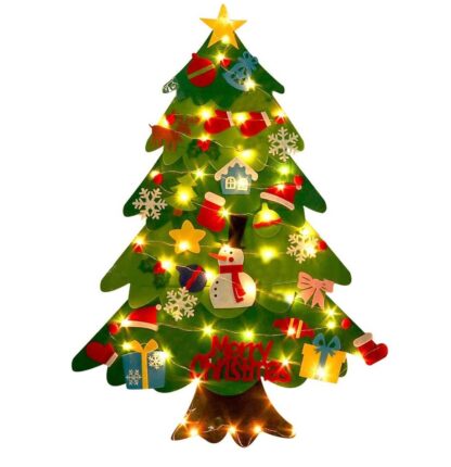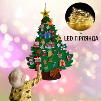 Материал елочки – фетр, приятный на ощупь и гипоаллергенный. В комплект входит елка и украшения из фетровой ткани, а также для придания еще большой праздничности ми дарим Led гирлянду.
