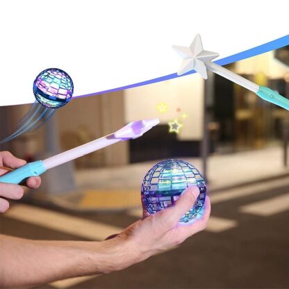 В комплектации есть волшебная палочка-контроллер, которая заряжается от батарейки. Благодаря магнитным токам она взаимодействует со спиннером, притягивая его к себе. Это можно использовать, чтобы ловить спиннер или управлять его полетом, продлевая и меняя направление.