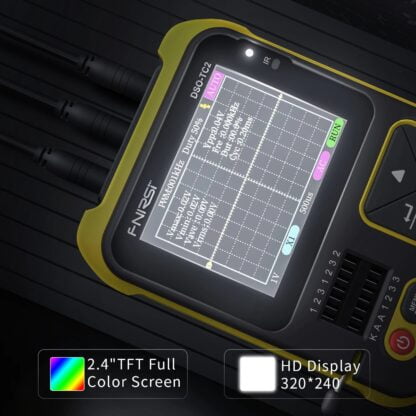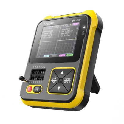 FNIRSI-TC2 успешно совмещает цифровой осциллограф, тестер электронных компонентов, генератор сигналов PWM и другие функции в одном устройстве. Оснащен широкоформатным цветным TFT-дисплеем размером 2,4″ c большими углами обзора и подсветкой. Питается от встроенной перезаряжаемой литиевой батареи, ёмкостью 1500 mAh c возможностью зарядки через порт USB type-C. Время автономной работы – 4-5 часов.
