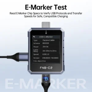 Также FNIRSI FNB-C2 поддерживает тестирование кабелей USB-C с E-Marker чипом, что позволяет определить характеристики кабеля, включая максимально допустимую мощность и поддерживаемые режимы передачи энергии. Это помогает выявить некачественные кабели, нестабильные блоки питания или проблемы с USB-портами, которые могут влиять на скорость зарядки.
