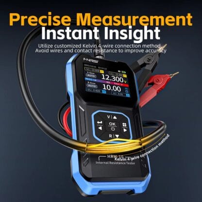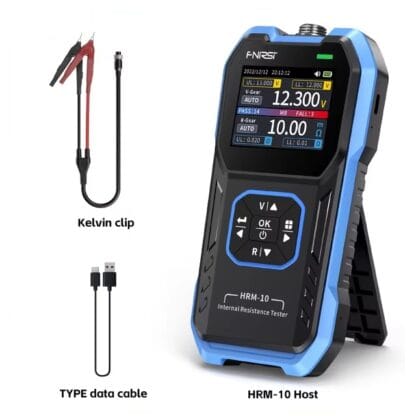 - Комплектация: Тестер внутреннего сопротивления FNIRSI HRM-10, щупы четырехпроводные, крепление аккумулятора, кабель USB C-type, руководство пользователя