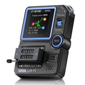 FNIRSI LCR-P1 – это многофункциональный тестер электронных компонентов, предназначен для определения и анализа характеристик полупроводниковых компонентов, таких как транзисторы, диоды, триоды и полевые транзисторы (FET). Оснащен цветным экраном, позволяет проводить измерения параметров различных компонентов, автоматически определяет тип и расположение выводов тестируемого компонента. Для управления две кнопки: круглая “Test” для включения и запуска теста, поменьше “Zener” – для теста стабилитронов и переключатель тест компонентов / тест ИК-сигналов.