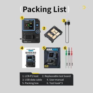 • Комплектация: Измеритель LCR-P1 , Плата для теста SMD компонентов, Кабель для зарядки и передачи данных, Руководство пользователя (английский и китайский), Тестовые провода с зажимами (3 шт.)