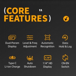 В этом приборе используются передовые измерительные технологии для обеспечения высокой точности и стабильности. Его 1,14 дюймовый цветной экран и функция магнитной адсорбции повышают удобство использования. Встроенная литиевая батарея 250mAh обеспечивает длительное время работы и поддерживает три частоты: 100 Гц, 1 кГц и 10 кГц. с уровнями тестирования 0,3 V, 0,6 V RMS. Через порт Type-C доступно обновление встроенной прошивки с помощью ПК (а не только зарядка). Также историю измерений можно просмотреть на ПК. Языки меню английский и китайский.