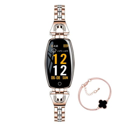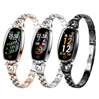 Корпус и браслет гаджета металлические, и могут быть трех цветов: серебро, розовое золото и черный. Фитнес-браслет защищен от воды по стандарту IP67, то есть он выдержит погружение под воду на глубину до 1 метра в течение 30 минут. Несмотря на свой не совсем спортивный внешний вид, Смарт браслет H8 поддерживает все функции, которые мы привыкли видеть в фитнес-трекерах. Он может считать шаги, калории и расстояние, напоминать об активности, измерять пульс в режиме 24/7, измерять артериальное давление и принимать уведомления и сообщения с подключенного смартфона. Одной зарядки аккумулятора емкостью 120 мАч будет достаточно для работы браслета до 10 дней в режиме ожидания и до 5 дней обычного использования.