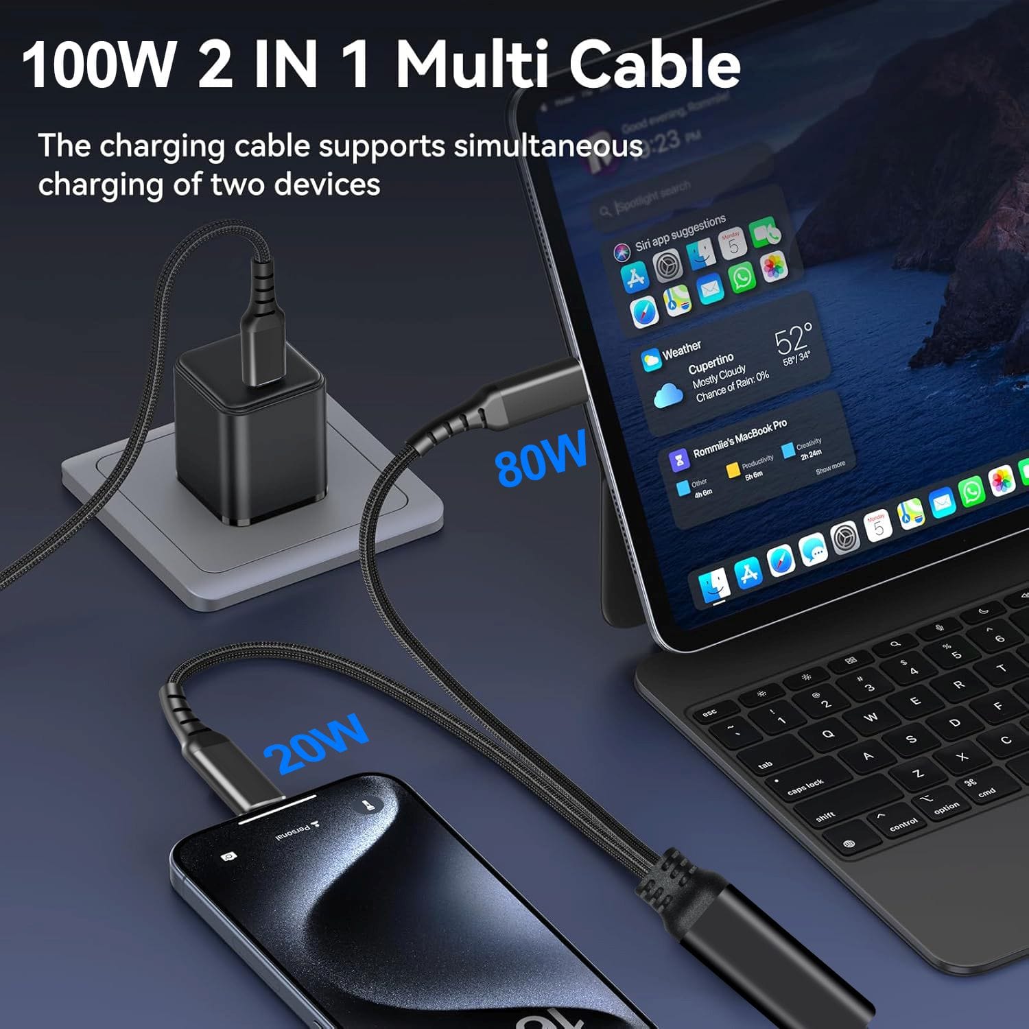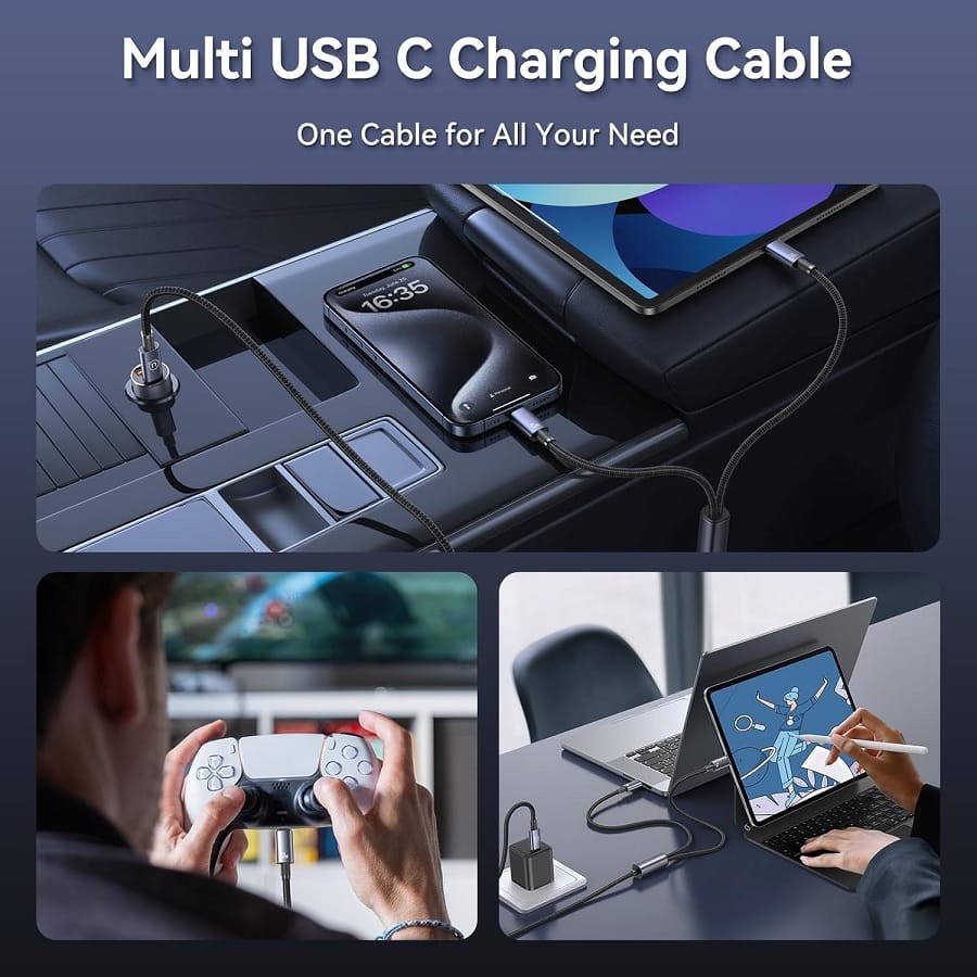 • Двойная зарядка с интеллектуальным управлением питанием – каждый порт кабеля USB-C к USB-C 2 в 1 работает независимо, позволяя одновременно заряжать устройства без помех. Это гарантирует, что каждое устройство получает оптимальную скорость зарядки, в которой оно нуждается. Этот интеллектуальный кабель имеет встроенный чип Super E-MARK, который регулирует напряжение и ток, чтобы обеспечить максимально быструю зарядку без перезарядки. Также он определяет, какое из устройств нуждается в более высокой мощности при одновременной зарядке 2 гаджетов.