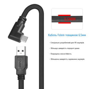 Специальный Кабель Folem имеет диаметр 6.5 мм! Дополнительная толщина кабеля позволят ускорить передачу данных, повысить износостойкость и улучить скорость зарядки Ваших очков виртуальной реальности.