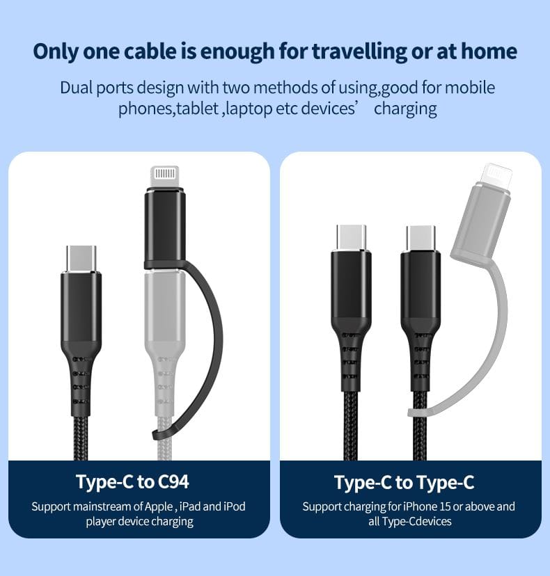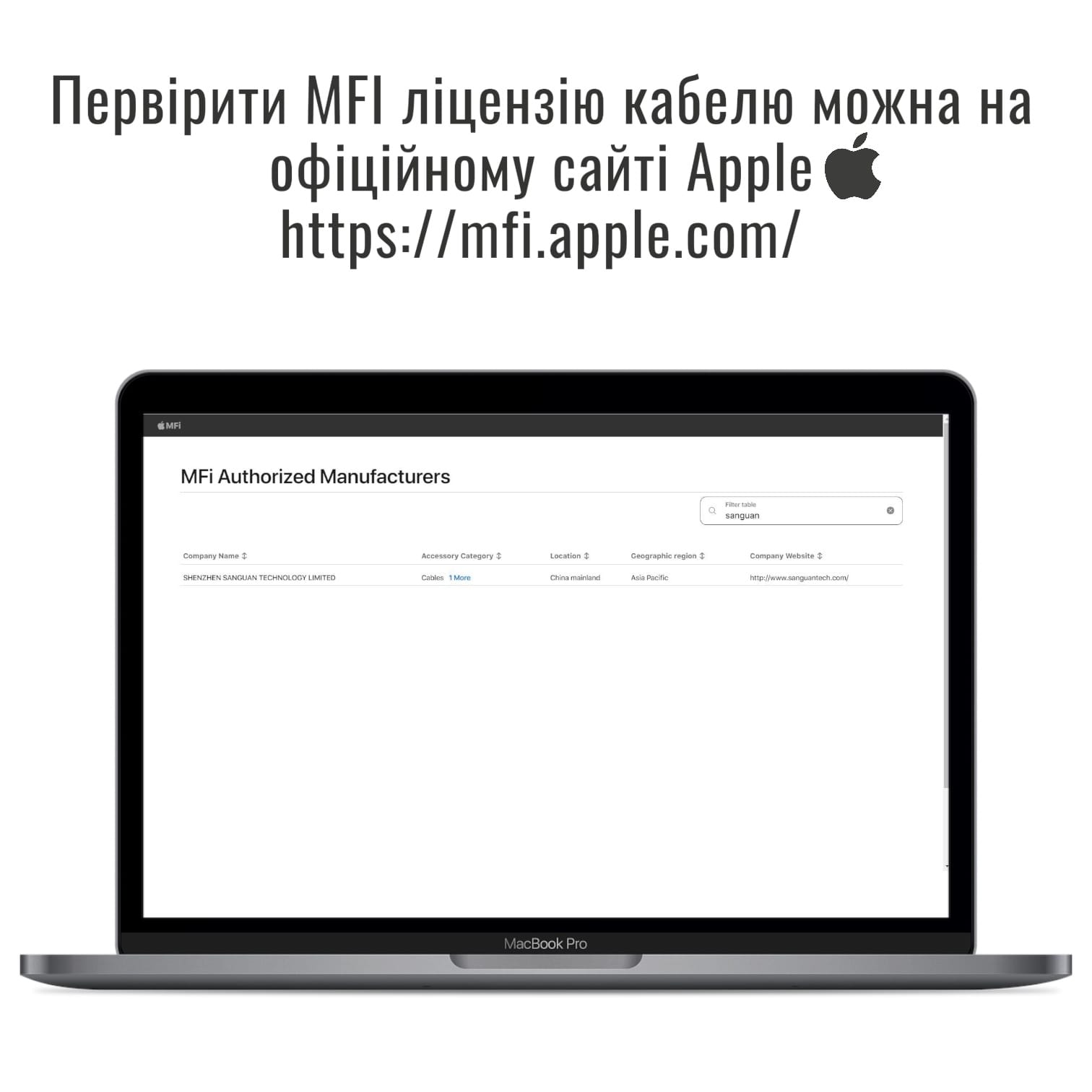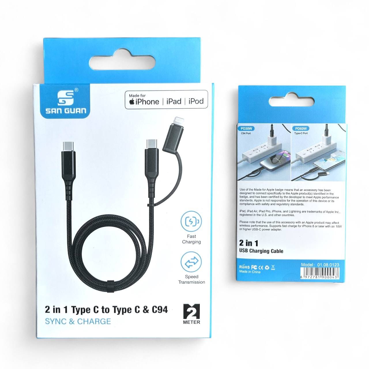 Кабель SanGuan 2 в 1 может использоваться как для Type-C, так и для Lightning девайсов, специально сертифицирован компанией Apple (MFI сертификат). Подходит для передачи данных и зарядки продуктов Apple (начиная с iPhone 8) и любых других девайсов Android и т.д.