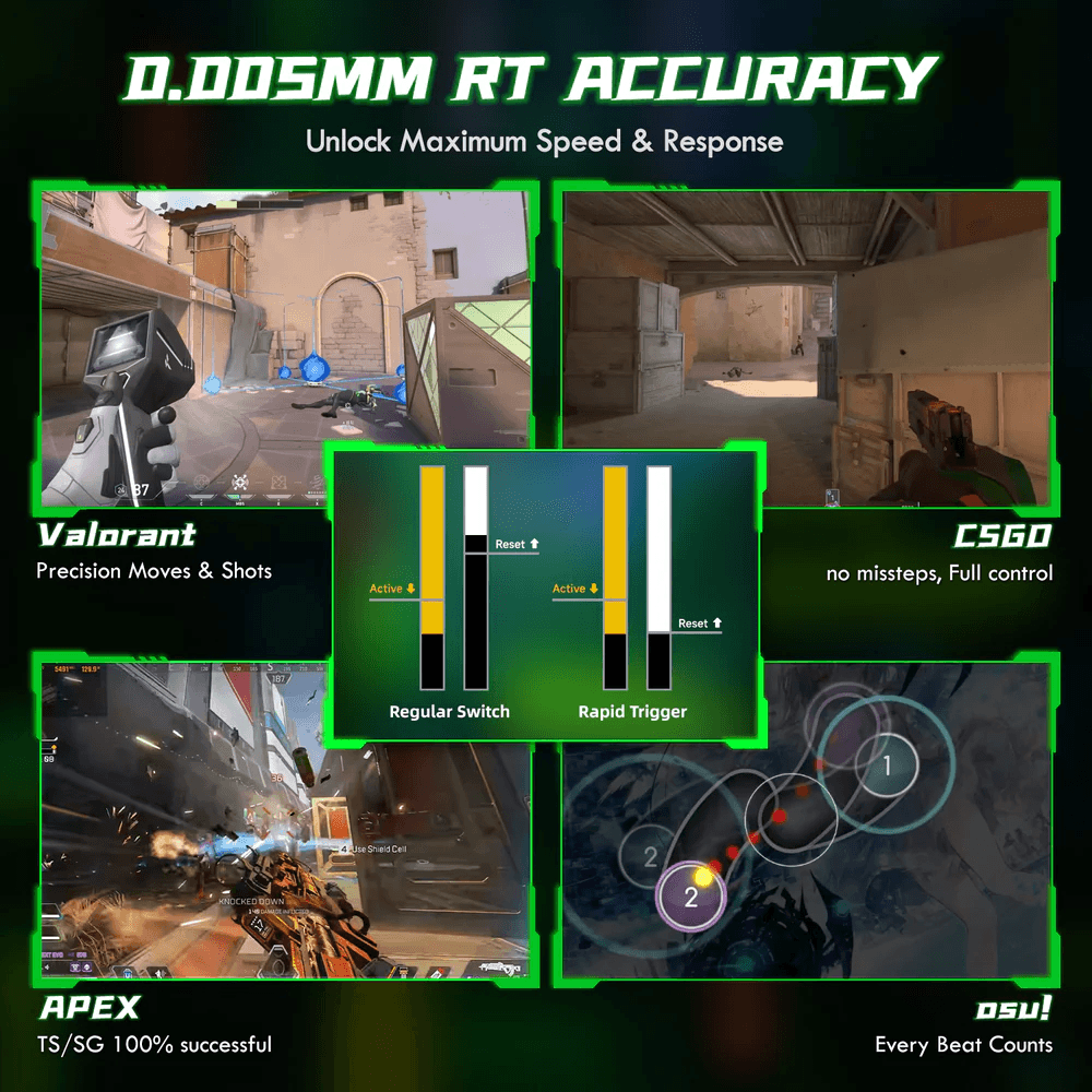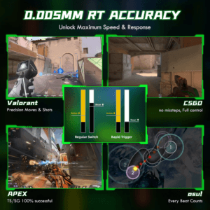 Клавиатура поддерживает регулируемую точку срабатывания от 0,1 до 3,3 мм и сверхточную RT-чувствительность до 0,005 мм без «мертвой зоны». Это позволяет мгновенно фиксировать нажатие и отпускание клавиш, что особенно важно в FPS-играх. Частота опроса 8000 Гц и задержка всего 0,08 мс обеспечивают максимально быструю передачу сигнала.