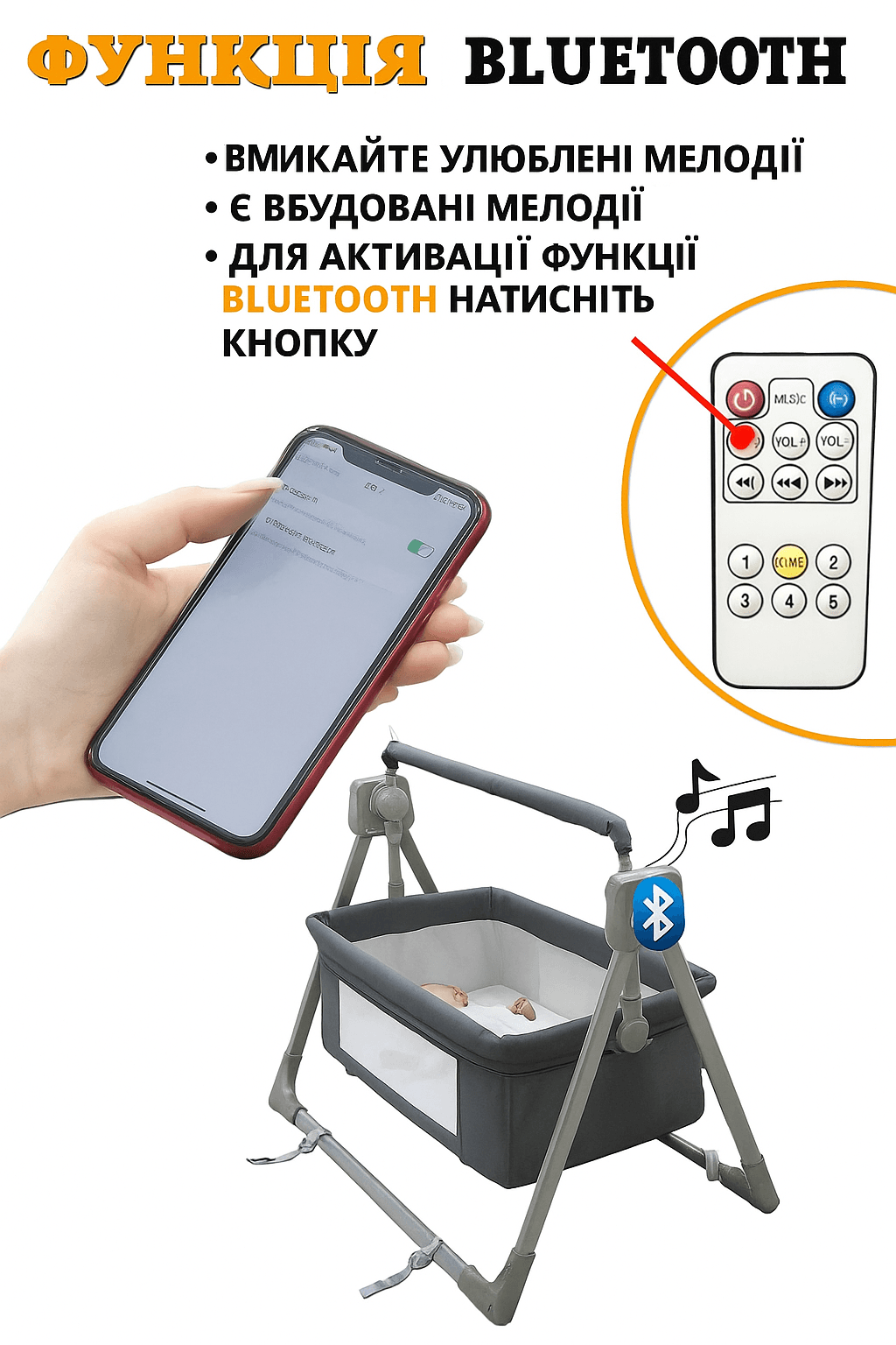 Передовые технологии помогают создать лучшую атмосферу для сна младенца. Успокаивающая музыка позволяет ребенку погрузиться в сладкий сон. Благодаря функции Bluetooth кроватку можно подключить к мобильному телефону, чтобы воспроизводить любимую музыку ребенка. Интеллектуальное управление также позволяет выбрать одну из 5 скоростей качания и установить таймер (15 мин, 30 мин, 45 мин).