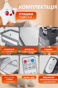 - Комплектация: колыбель, матрасик, пульт ДУ, блок питания с кабелем, подвесная дуга с игрушками, капюшон, подвесная корзинка(отсек для хранения), инструкция на английском