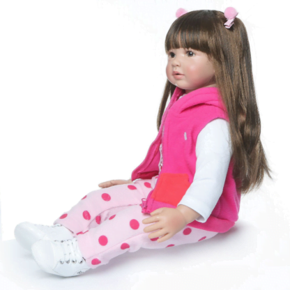 Тело – набивное, выполнено из ткани с наполнителем внутри, это делает куколку невероятно мягкой на ощупь и создает ощущение, что вы взяли на руки настоящего малыша. Игрушку нельзя мочить!! Куколка может двигаться конечностями, может сидеть или лежать, но не может стоять. Глазки из акрила обрамлены пушистыми ресничками. На голове парик из длинных темных волос, длина которых позволяет делать куколке прически. Все пропорции – окружность головы, ножки, ручки, соответствуют пропорциям ребенка, поэтому реборну подходит детская одежда ребенка 3-х месячного возраста. Одета девочка Ким в гольф белого цвета и спортивный костюмчик. В комплекте с куклой также идут заколки на волосы и кроссовки.