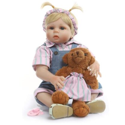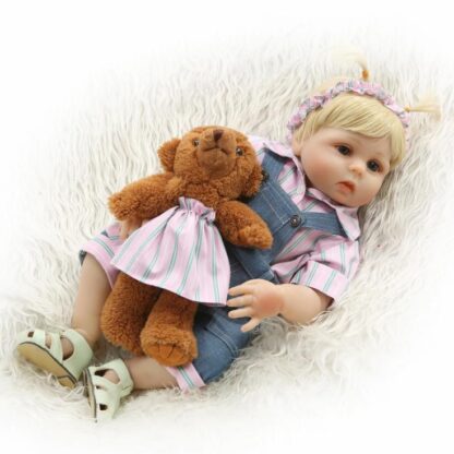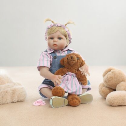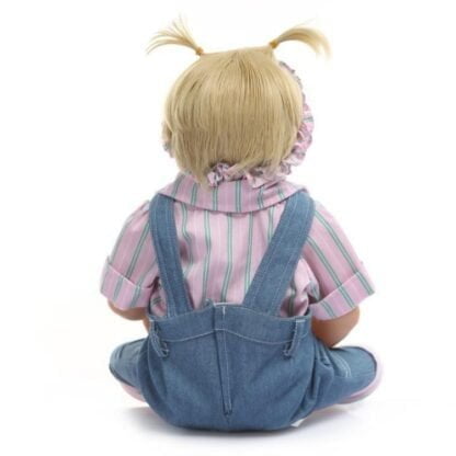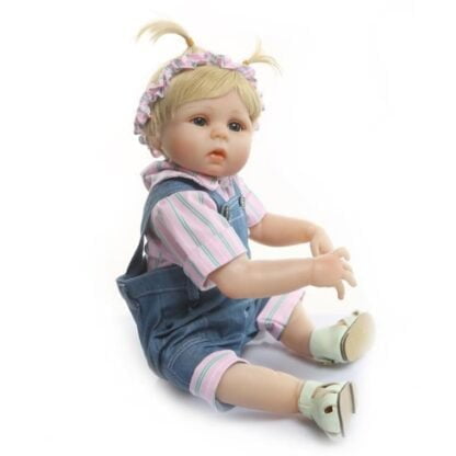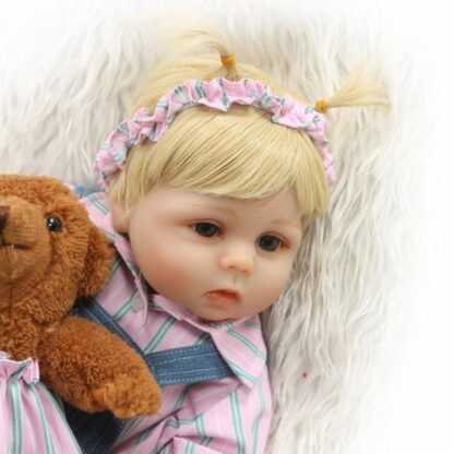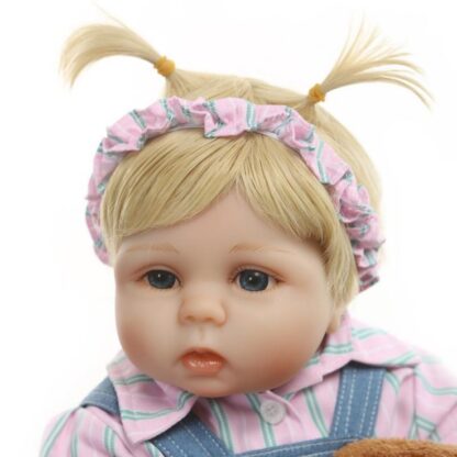 Эта кукла размером с новорожденного младенца, её высота 48 см. Пышные короткие волосы цвета блонд можно расчесывать, заплетать в коротенькие косички или завязывать в хвостики. Густые объемные ресницы тоже выглядят очень натурально. Глаза сделаны из высококачественного прозрачного акрила, они не закрываются и не открываются. Сама кукла изготовлена из силикона. Этот материал мягкий, нетоксичный, гипоаллергенный и приятный на ощупь. Все нюансы цвета кожи переданы в точности, даже прорисован румянец на пухлых щечках. Куклу Реборн так и хочется потрогать, обнять и прижать к себе.