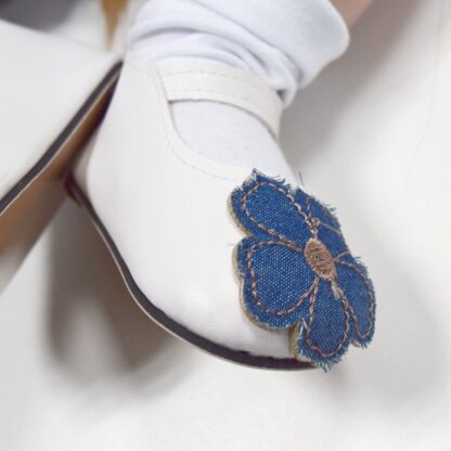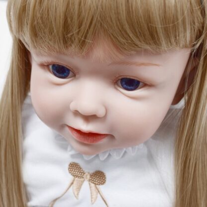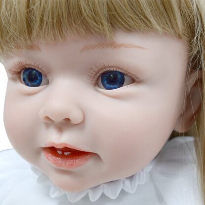 Тело — набивное, выполнено из ткани с наполнителем внутри, это делает куколку невероятно мягкой на ощупь и создает ощущение, что вы взяли на руки настоящего малыша. Игрушку нельзя мочить!! Голова и конечности игрушки изготовлена на основе безопасного и нетоксичного силиконового материала с необычайным сверхъестественным мастерством. Эта детская игрушка очень мягкая и гибкая, может садиться и лежать. Глазки из акрила обрамлены пушистыми ресничками. На голове парик из светлых волос, длина которых позволяет делать куколке прически. Все пропорции — окружность головы, ножки, ручки, соответствуют пропорциям годовалого ребенка, поэтому реборну подходит детская одежда для этого возраста. Одета Роза в футболку белого цвета и джинсовую юбку/шорты. В комплекте с куклой также идет ободок на голову и босоножки.