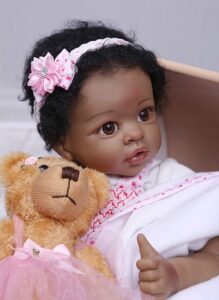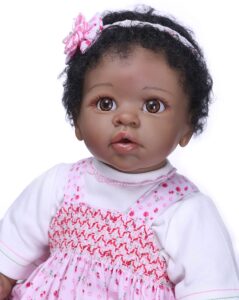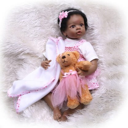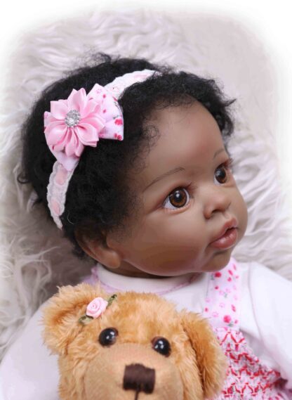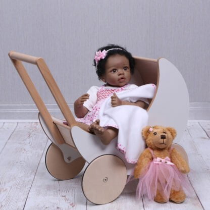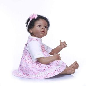 Тело – набивное, выполнено из ткани с наполнителем внутри, это делает куколку невероятно мягкой на ощупь и создает ощущение, что вы взяли на руки настоящего малыша. Игрушку нельзя мочить!! Куколка может двигать конечностями, может сидеть на краю или лежать, но не может стоять. Глазки из акрила обрамлены пушистыми ресничками. На голове парик из темных кучерявых волос. Все пропорции – окружность головы, ножки, ручки, соответствуют пропорциям ребенка, поэтому реборну подходит детская одежда ребенка месячного возраста. Одета девочка Меган в гольф белого цвета и платье. В комплекте с куклой также идет ободок на голову и подгузник.