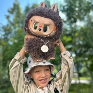 Labubu Zimomo – это персонаж, принадлежащий к вселенной “The Monsters”, созданной художником Kasing Lung. Zimomo является лидером племени эльфов Лабубу и имеет черты, напоминающие дракона, такие как шипастый хвост. Он отличается от других персонажей своей более крупной фигурой и “серьезным” видом. В игрушке сохранились характерные для Labubu черты, такие как большие глаза, заостренные уши и девять острых зубов. Благодаря мягкому и пушистому материалу, имитирующему шерсть, Zimomo очень приятная на ощупь. В игрушке двигаются конечности и глаза, хвост изгибается под разными углами. В комплект входит аксессуар – кулон на цепочке с надписью “The Monsters”.