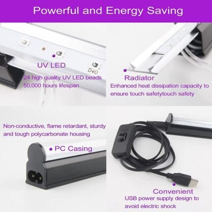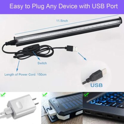 - Plug and Play: ультрафиолетовая лампа может получить питание от любых USB портов – от ноутбука, USB адаптера, павербанка, компьютера, и т.д.