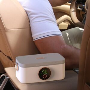 Встроенный аккумулятор на 8 000 Mah способен разогревать еду до 60 °C за 10-60 минут в зависимости от количества еды и наружной температуры. Вместительность лотка 1 л. Вес Ланч бокса 0,9 кг.