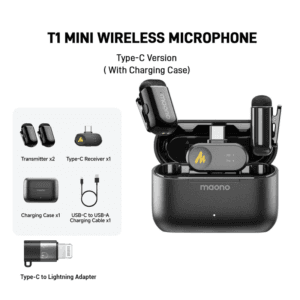 Type-С версия микрофона Maono Wave T1 Mini совместима с iPhone 15,16,17 и Android смартфонами. С помощью переходника Вы можете подключить микрофон к более старым версиям iPhone 14,13,12,11 с Lightning разъемом.