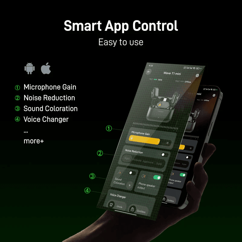 - 4-уровневое шумоподавление с помощью искусственного интеллекта: мини-микрофон Wave T1 с зажимом поддерживает включение/выключение шумоподавления одним нажатием, в сочетании с регулировкой усиления 32 дБ и функцией интеллектуального автоматического ограничения, что обеспечивает кристально чистую и насыщенную запись в шумной обстановке.
