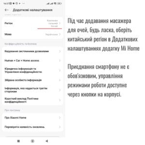 Все режимы работы включаются кнопками на корпусе без присоединения смартфона, если Вы хотите присоединить смартфон необходимо загрузить приложение Mi Home, после регистрации в приложении в поле Регион выберите пункт Материковый Китай, после этого найдите Smart Eye Massager в списке девайсов.