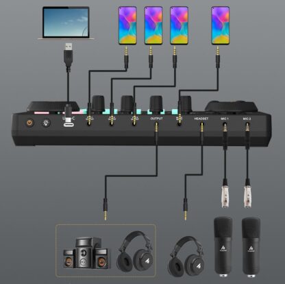 Микшерный пульт Maono имеет передовые технологии, которые позволяют пользователю управлять уровнями звука и добавлять живой вокал и звуковые эффекты (четыре из которых являются программируемыми) с помощью всеобъемлющего набора инструментов, чтобы избежать трудоемкой постобработки и редактирования.