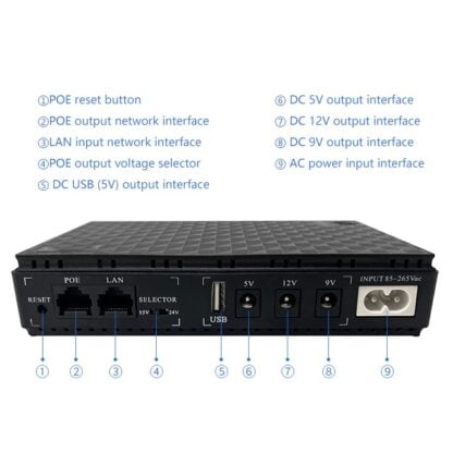 Встроенные литиевые батареи на 10400Mah, высокая совместимость, подходящие характеристики для большинства цифровых продуктов на рынке. Есть опция выбора выходного напряжения постоянного тока 5 В/9 В/12 В. Mini UPS оборудован защитой от перезарядки, защитой от перегрузки по току и защитой от короткого замыкания. Преобразование тока с нулевой миллисекундой задержки.