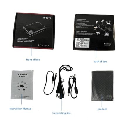 - Комплектация: Mini UPS, Кабель DC to DC 5.5 x 2.1 длина 20 см, Кабель DC-to 2xDC 5.5 x 2.1 длина 20 см, инструкция на китайском, кабель подключения в сеть 220V длина 60 см