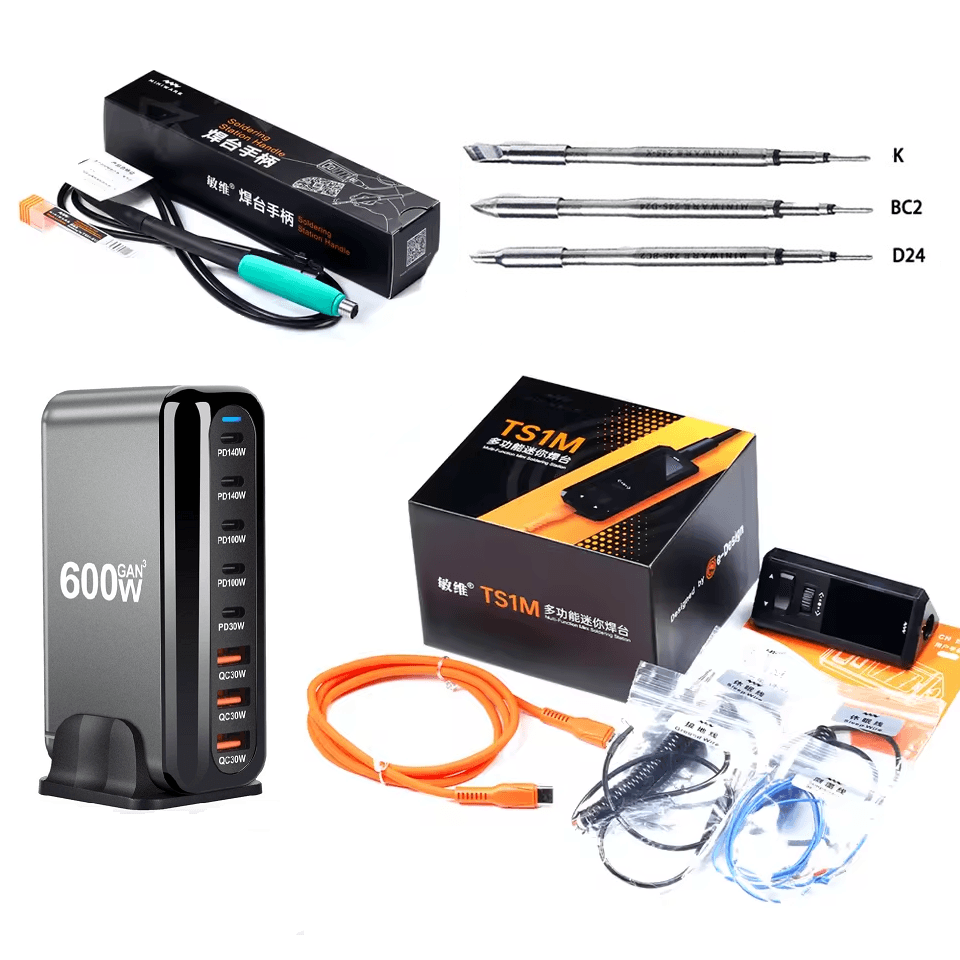 - Комплектация с блоком питания: Блок питания YMX 600W (PD 3.1 140W), паяльная станция TS1M, термопара, заземляющий провод, кабель питания Type-c, руководство пользователя на английском, ручка паяльника С245, жала паяльника K,BC2,D24.