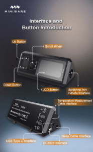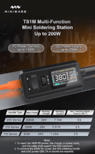 - Комплектация без блока питания: паяльная станция TS1M, термопара, заземляющий провод, кабель питания Type-c, руководство пользователя на английском, ручка паяльника С245, жала паяльника K,BC2,D24.