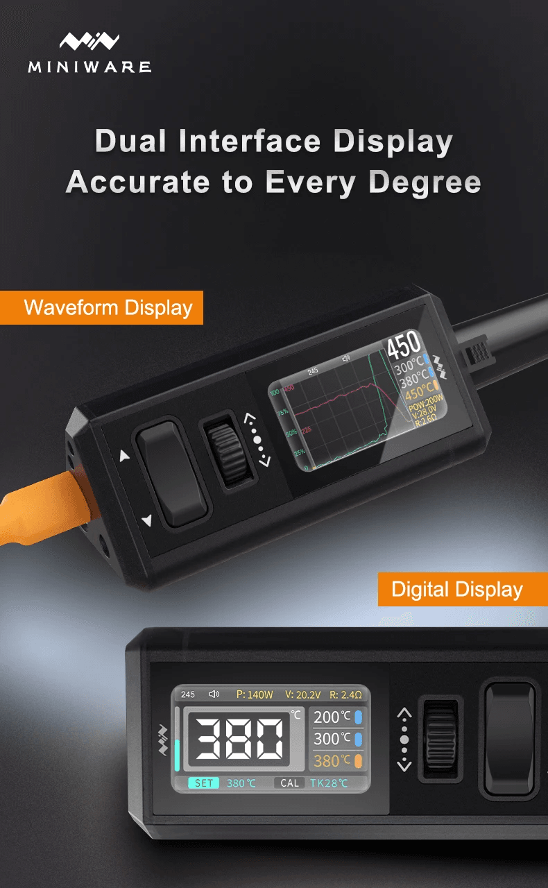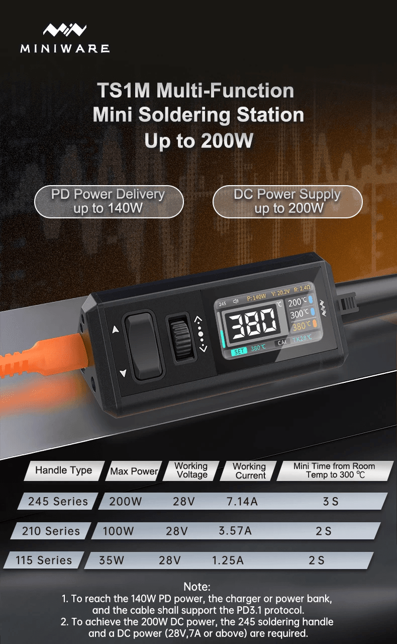 Многофункциональная паяльная станция TS1M поддерживает двойной режим питания, совместима с протоколом быстрой зарядки PD3.1 (напряжение 12-28 В, максимальная мощность 140 Вт); при использовании питания DC максимальная мощность может быть повышена до 200 Вт (12-28 В). Диапазон регулировки температуры охватывает 100-450°C, что подходит для различных сценариев пайки.