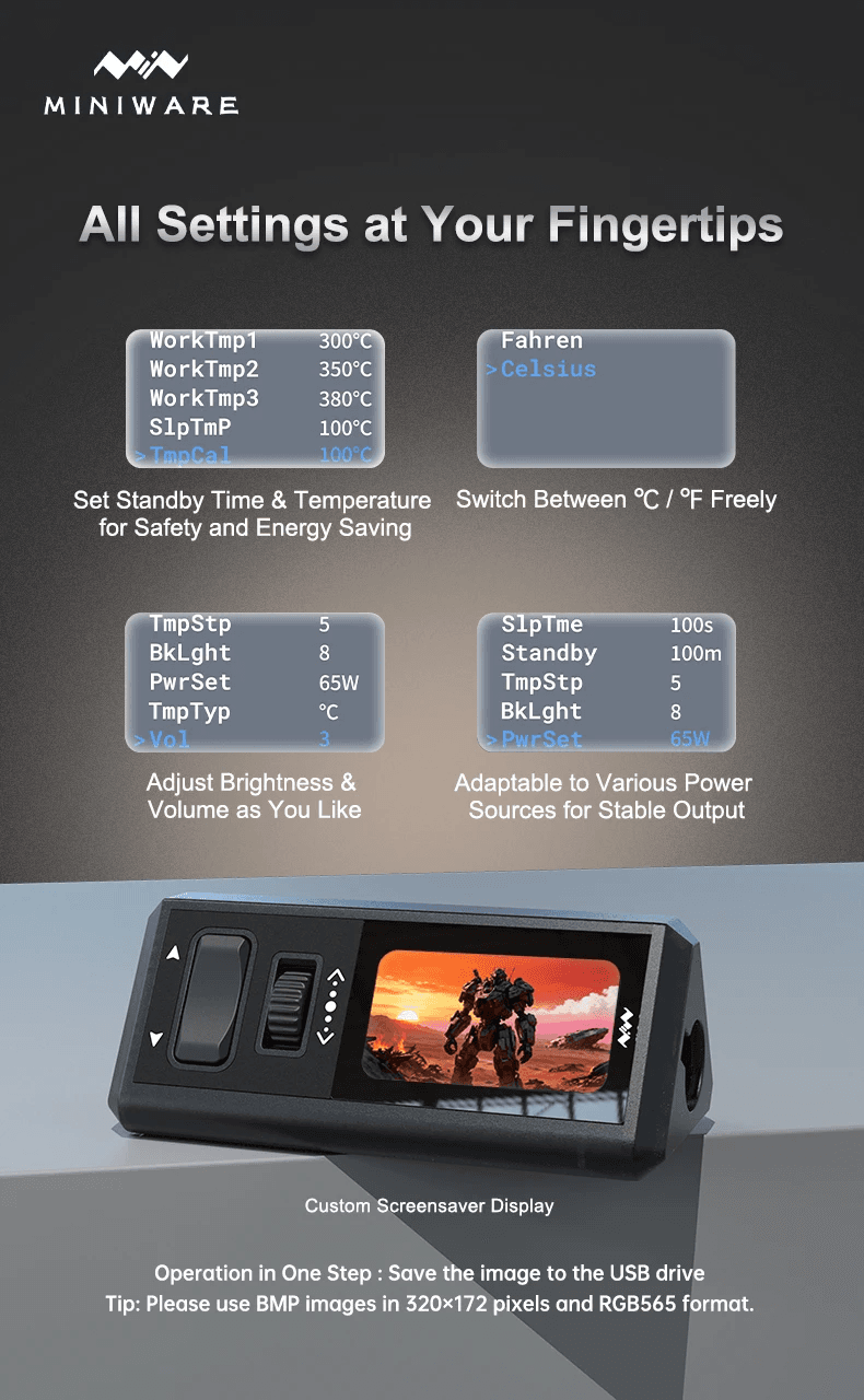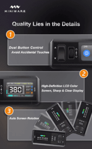 - Оснащена 1,47-дюймовым экраном с разрешением 320×172 пикселя, интерфейс простой, температура отображается в реальном времени. Дизайн с колесиком и двумя кнопками обеспечивает удобство управления.