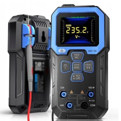 DMT-99 обладает богатым функционалом, позволяющим измерять переменное и постоянное напряжение, силу тока, сопротивление, емкость, частоту, температуру и транзисторы. В интеллектуальном режиме цифровой мультиметр DMT-99 может идентифицировать содержимое измерения и выбрать диапазон с лучшим разрешением, что делает измерение более удобным и быстрым. Он также оснащен функцией проверки диодов и звуковым уведомлением о низком уровне заряда батареи. Имеется возможность обновления прошивки через ПК и кастомная настройка интерфейса экрана. Информативный цветной дисплей с диагональю 2.4″ и разрешением 320х240 пикселей, отображает данные в числовом формате, в виде записи графика и в виде шкалы. В меню есть русский язык.