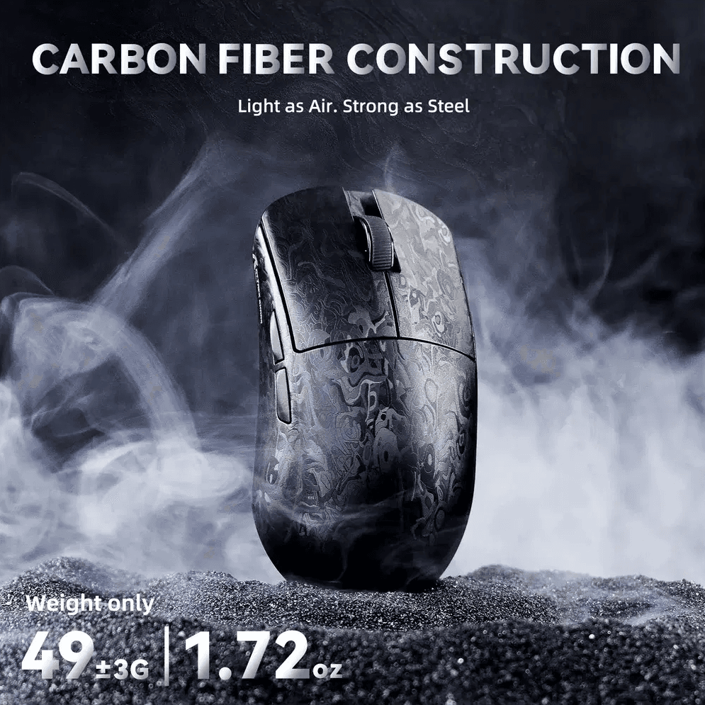 - Суперлегкая конструкция: Благодаря корпусу из композитного углеродного волокна, мышь весит всего ~49 г, что обеспечивает чрезвычайную маневренность и минимальную нагрузку на кисть.