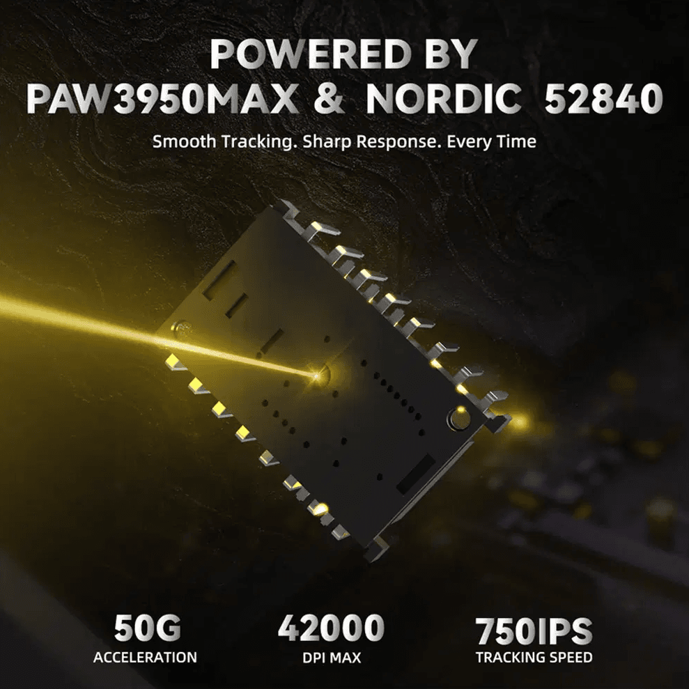- Сенсор PAW3950MAX: Высокоточный оптический сенсор PixArt с максимальной чувствительностью до 42 000 DPI, ускорением до 50G и скоростью отслеживания 750 IPS.