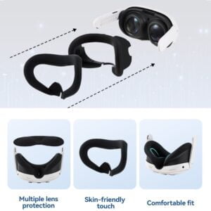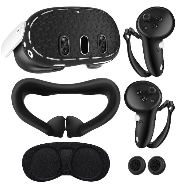 - Комплектация: Чехол для Quest 3, Накладка для лица, Чехлы для контроллеров 2 шт, Колпачки для кнопок 2 шт, Накладка на линзы