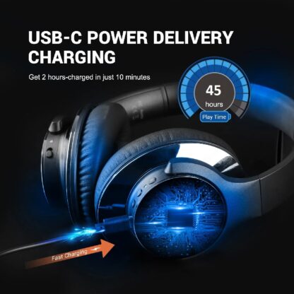 - Удобное управление. Все кнопки управления расположены снизу. На левом наушнике: разъём USB Type-C, кнопка активации шумоподавления. На правом: разъём 3.5 мм для провода, кнопки регулировки громкости + – , кнопка вкл/выкл. Переключатель ANC позволит переключаться между двумя режимами – режимом шумоподавления и режимом “прозрачности”. Многофункциональная клавиша отвечает не только за включение и отключение, но и за воспроизведение/паузу. Кнопки регулировки громкости могут переключать треки в двух направлениях (удержанием около 2 секунд).
