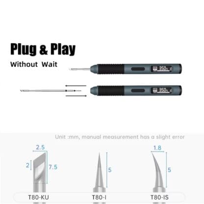 Портативный паяльник Alientek T80 100W с комплектом жал, совместимых с JBC C245. Паяльник Alientek T80 поставляется с комплектом из 3 жал T80-KU, T80-I, T80-IS. Совместимость паяльника T80 с жалами JBC C245 расширяет диапазон возможных профилей паяльных жал.
